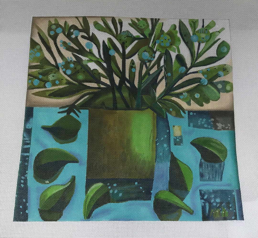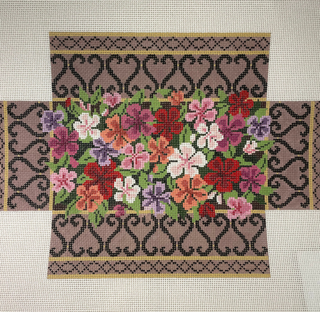 *SALE Susan Roberts Needlepoint 0371 Impatients in Brass and Iron Grillwork Brick Cover 13m